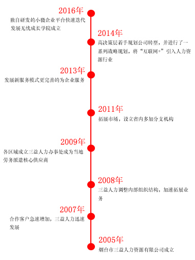 2008年8月,鄄城縣三益人力資源開發(fā)有限公司正式成立,鄄城公司的成立為公司今后的發(fā)展發(fā)揮重要作用。煙臺三益人力資源有限公司總部于2009年07月06日在煙臺工商局注冊成立。在公司發(fā)展壯大的10年里,我們始終為客戶提供好的產(chǎn)品和技術(shù)支持、健全的售后服務(wù)。公司先后在三十里堡、科信大廈、業(yè)達(dá)智慧谷、天宇市場開設(shè)了店鋪。2017年3月,三益威海分公司成立,大大拓寬了我們的國內(nèi)市場。